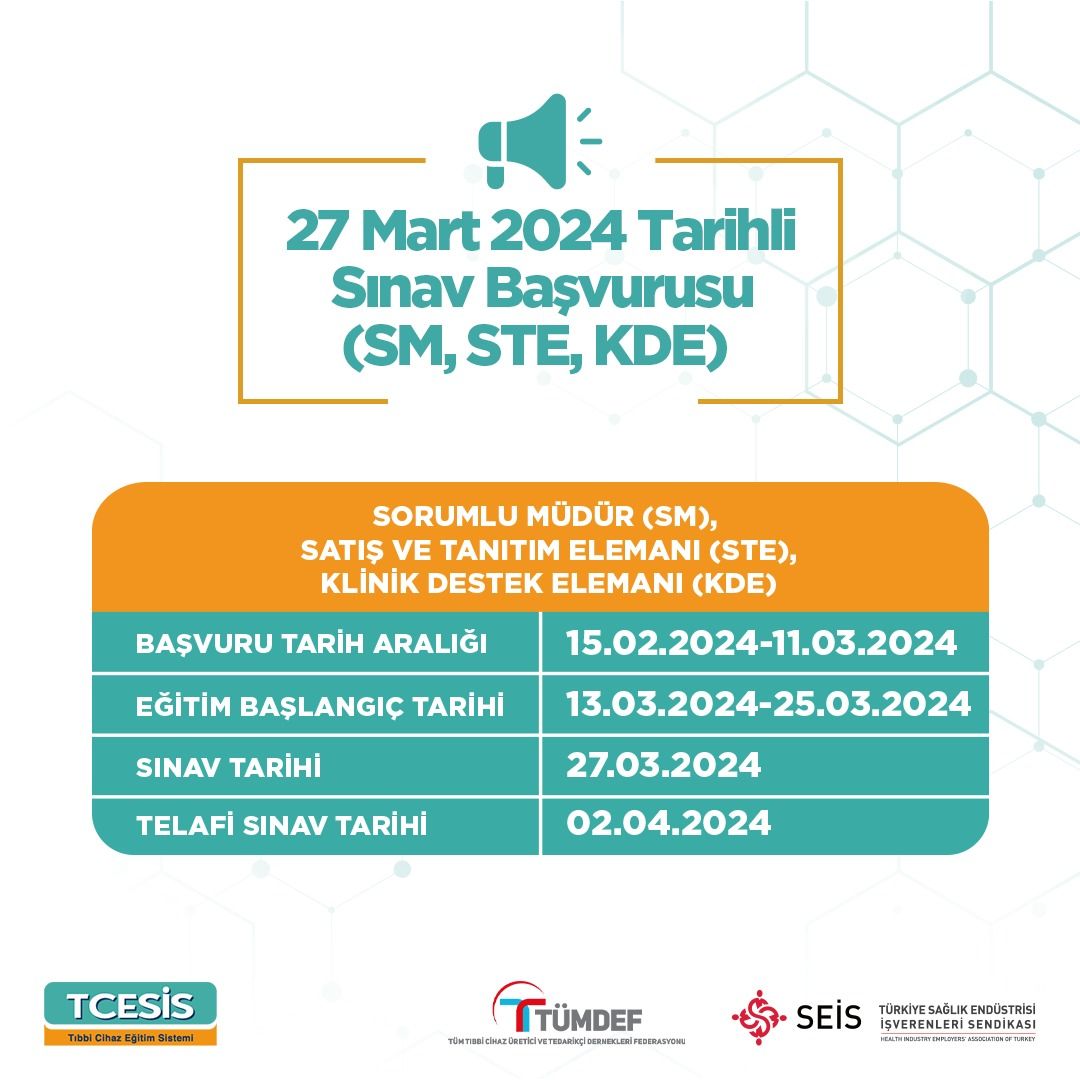 27 Mart 2024 tarihli Sorumlu Müdür, Satış ve Tanıtım Elemanı ile Klinik Destek elemanı sınavlarına katılabilmek için eğitim başvurusunda bulunacak adayların en geç 11 Mart 2024 günü mesai bitimine kadar başvurularını kesinleştirmiş olmaları gerekmektedir. Başvuru işlemlerine ilişkin detaylı bilgi almak için;